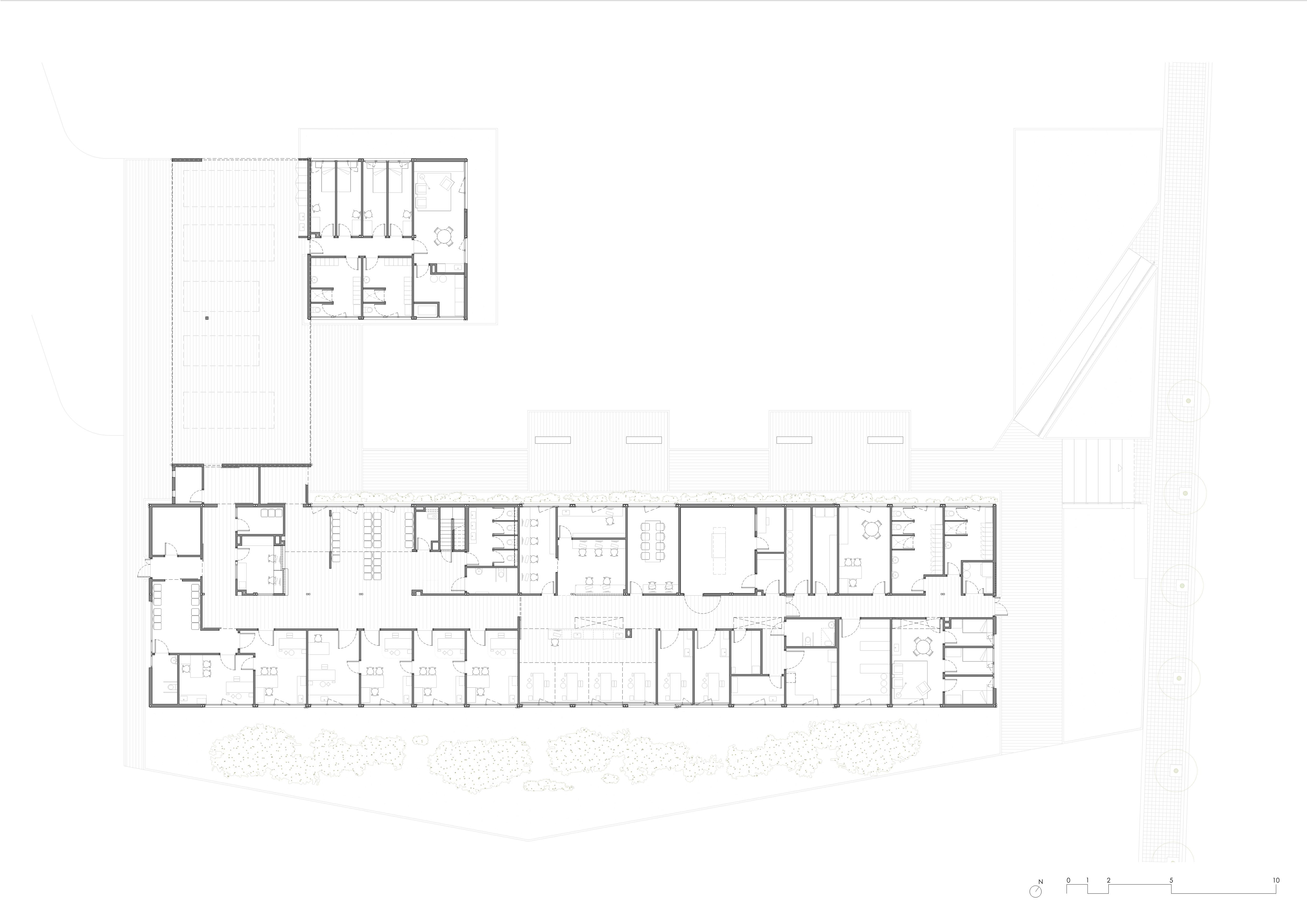 The interior layout is organised along a central circulation spine. On both sides are the different spaces, arranged according to their level of privacy: from public areas to areas restricted to healthcare personnel. This functional clarity improves orientation, internal efficiency and the user experience.
