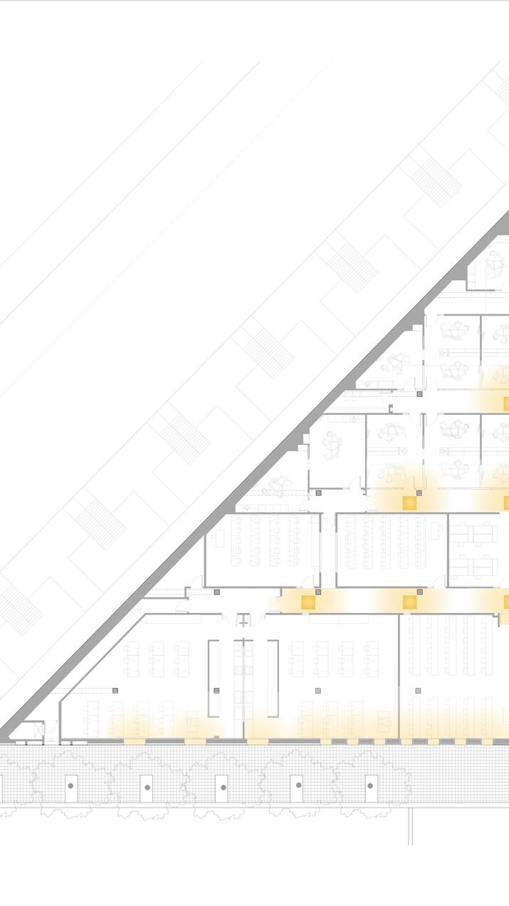 The intervention is based on this condition to structure both the layout and the atmosphere of the project. The routes, waiting areas and clinical spaces are organised around the existing light courtyards, which act as spatial nuclei and environmental regulators.