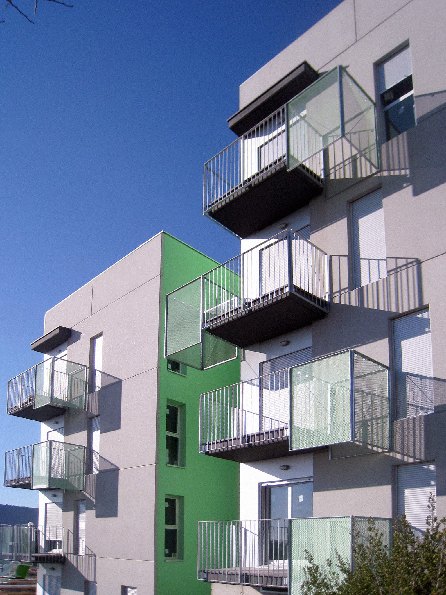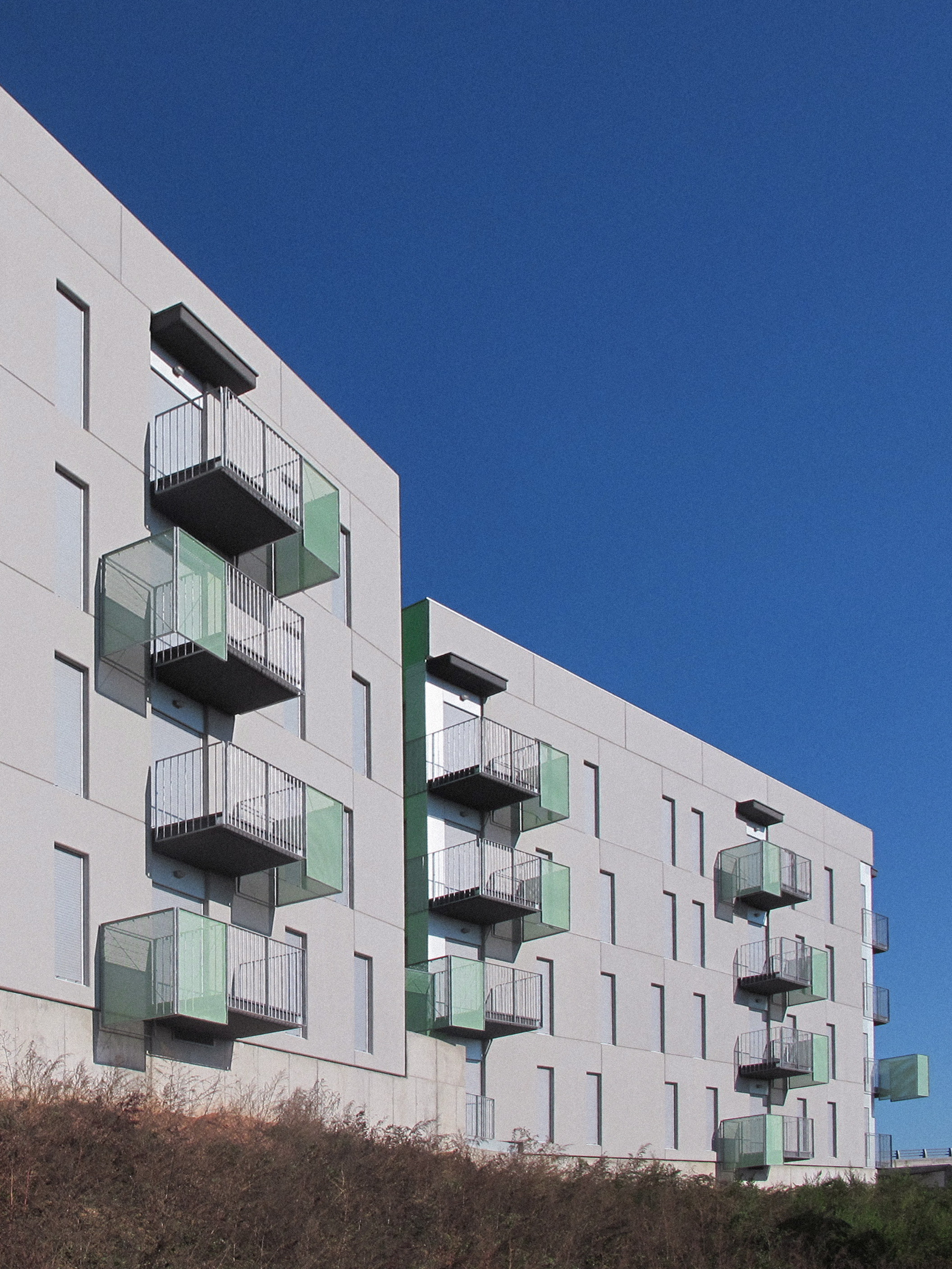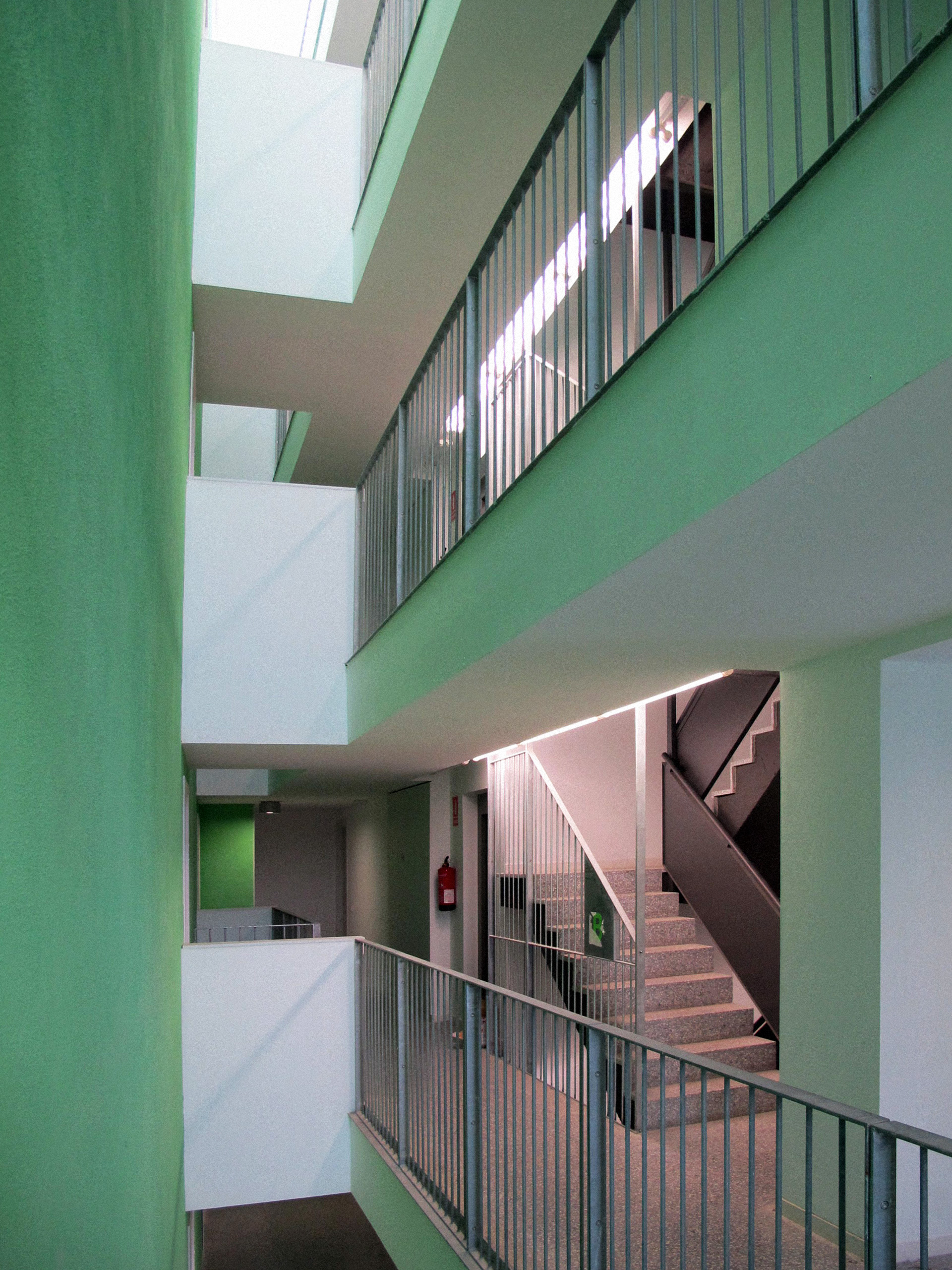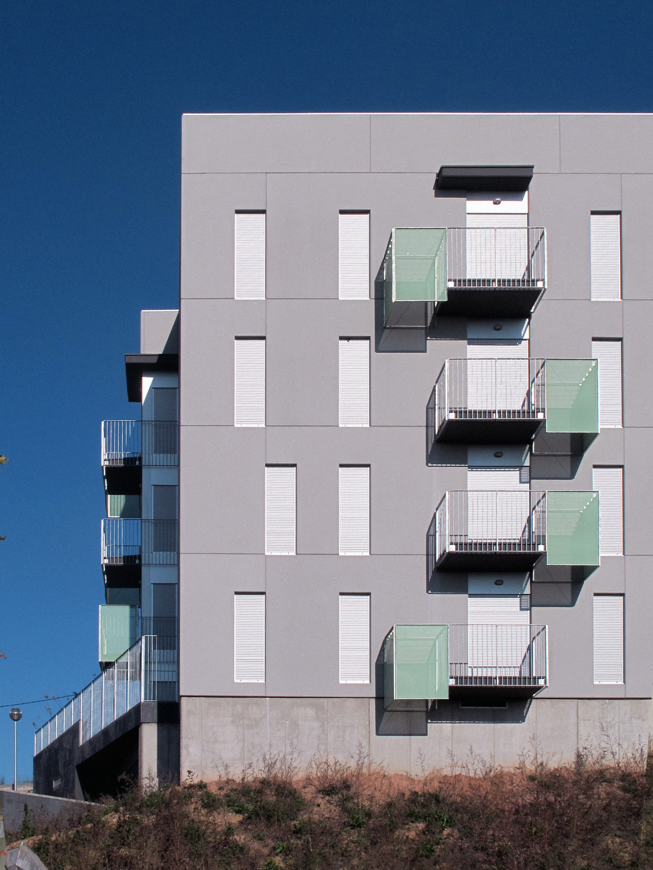 El edificio se fragmenta para adaptarse a las fuertes pendientes del terreno. Se generan dos bloques con dos núcleos de comunicación verticales diferenciados. Un bloque es destinado a viviendas de alquiler de unos 60 m² y el otro a viviendas de venta de unos 70 m², con accesos independientes y diferenciados (desde la calle Reverend Puigbó). Este dos bloques crean una androna en el punto de rotura, de forma que se favorece el asoleo a dos de las viviendas que situados en las barras a norte pueden disfrutar de la insolación directa requerida.