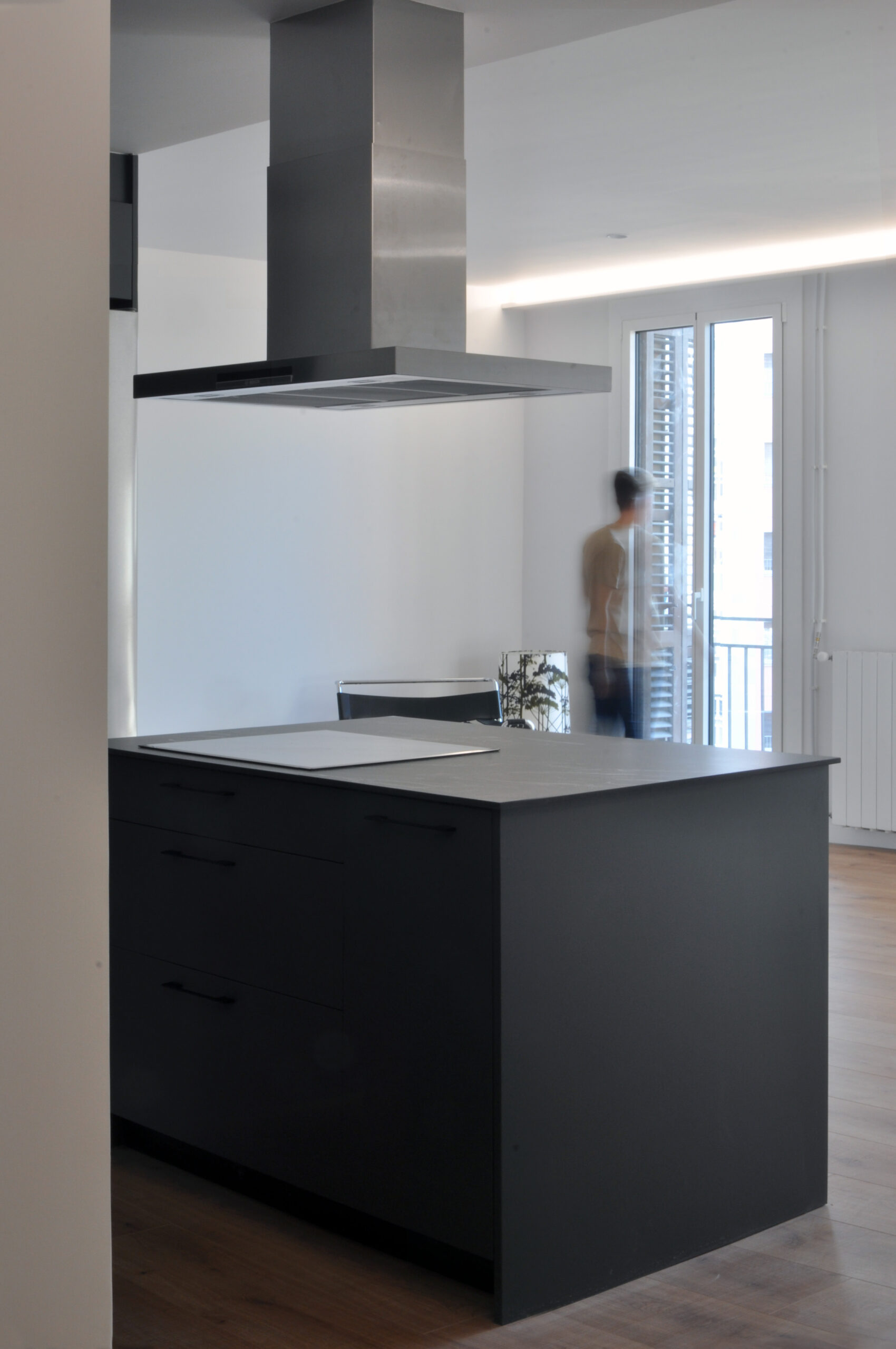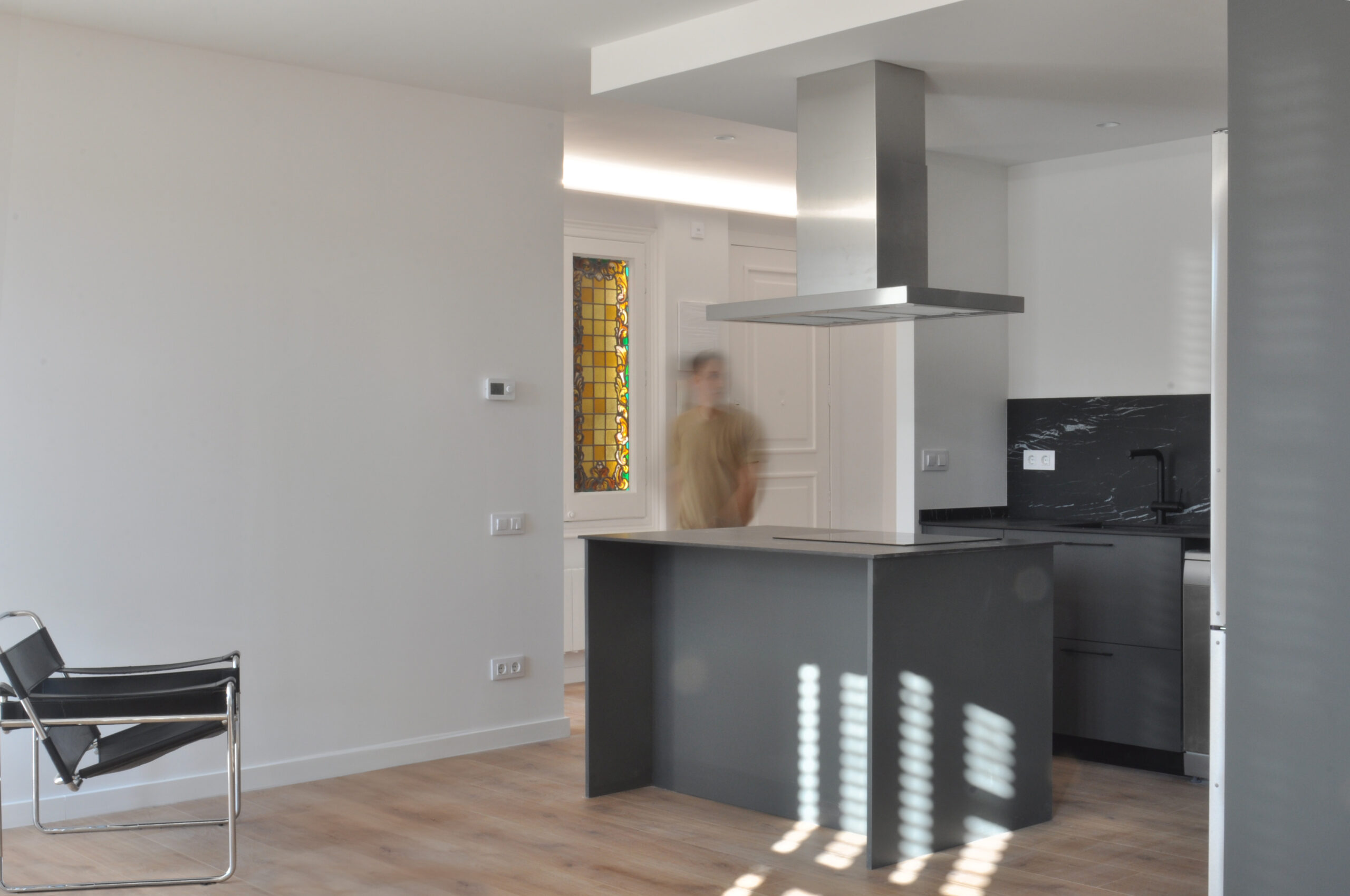 La reforma convierte la cocina en el núcleo organizador de la vivienda, dejando atrás su condición de espacio de servicio aislado. Desde esta nueva centralidad se conectan las zonas de día y de noche, integrando la circulación dentro de los espacios de uso y eliminando el pasillo como elemento residual. El resultado es una planta más fluida y funcional, adaptada a la vida cuotidiana contemporánea.